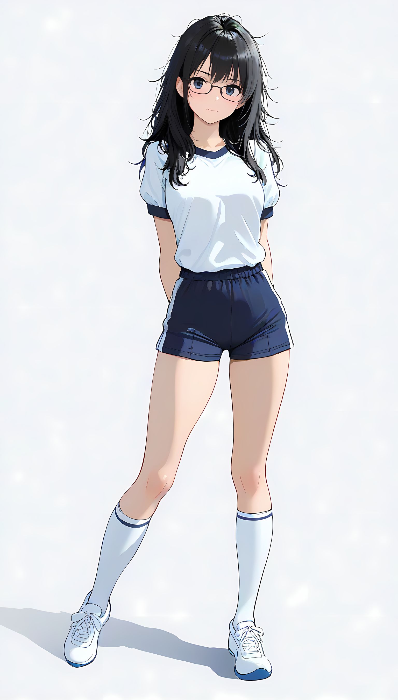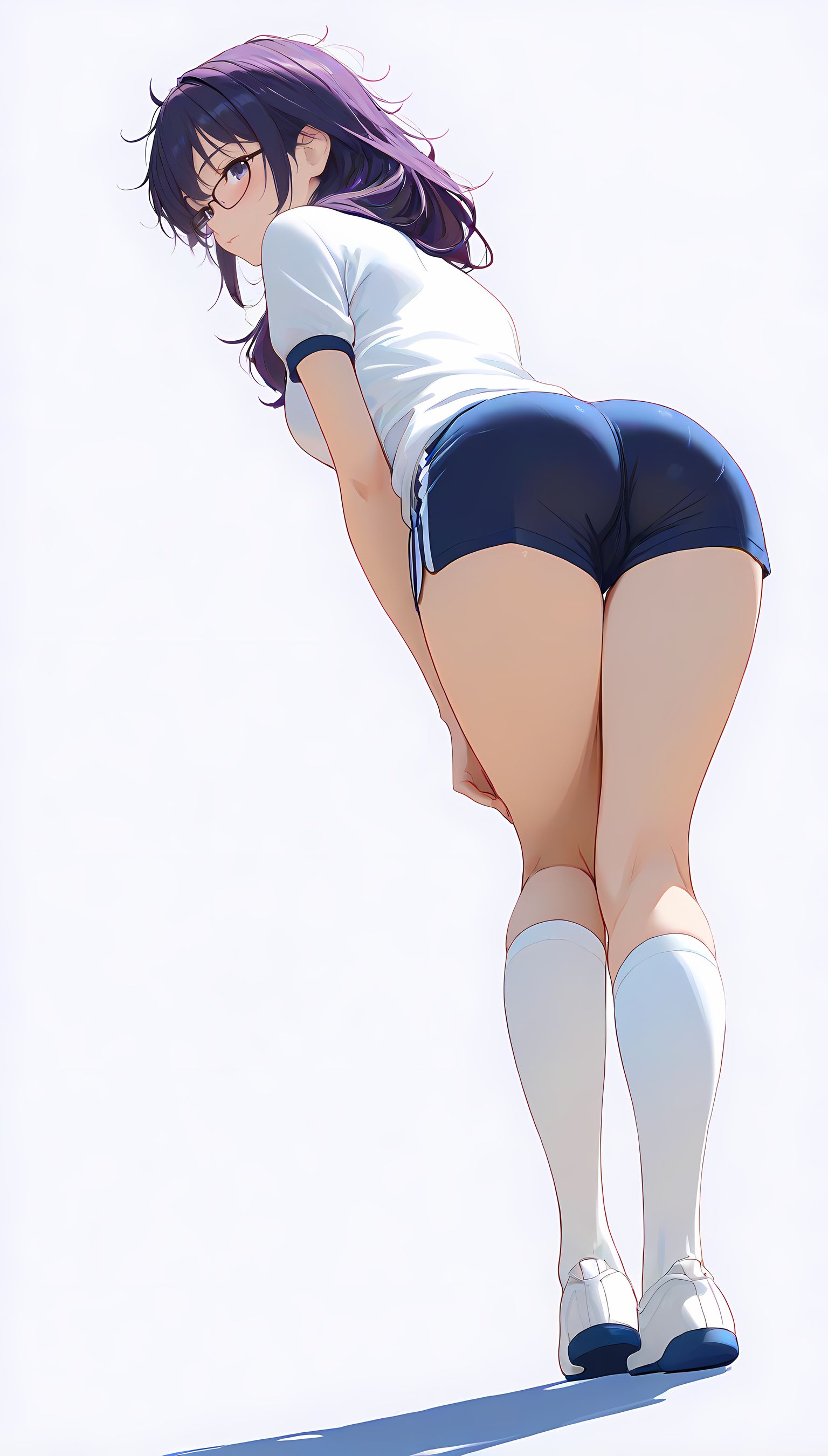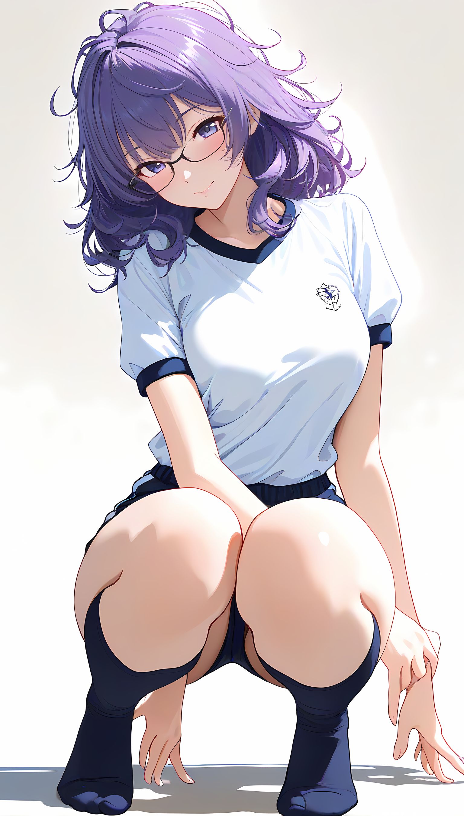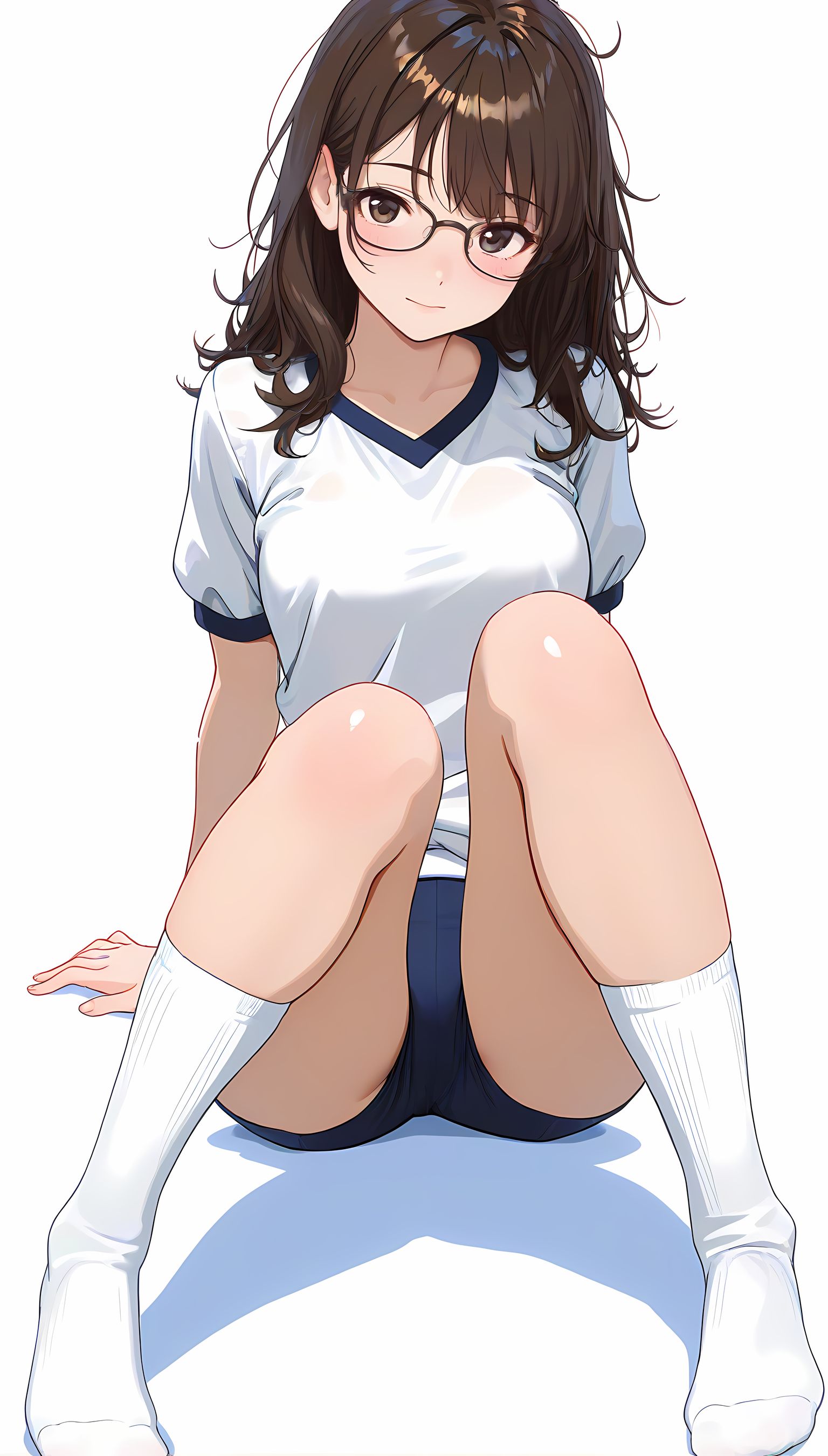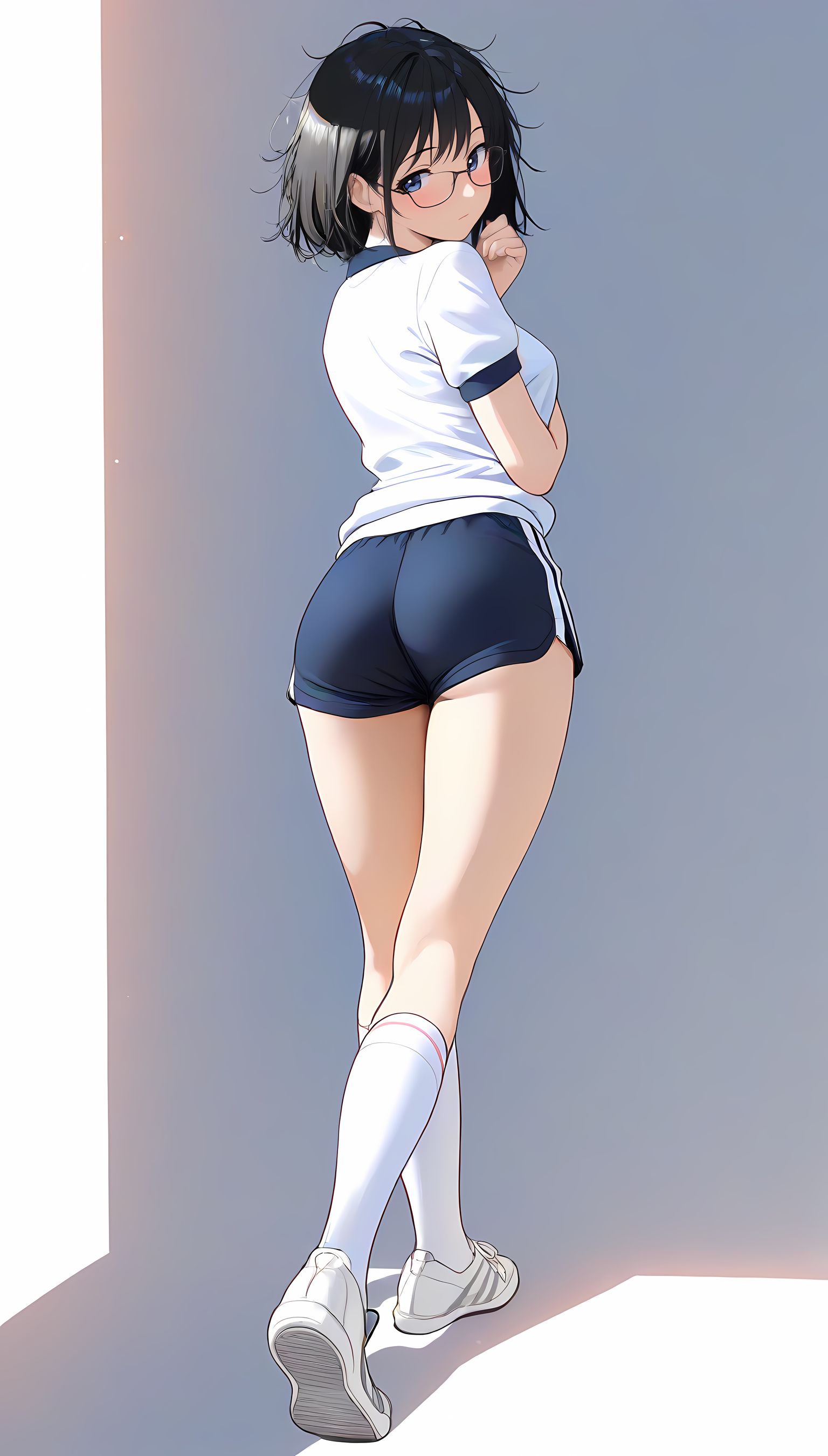 この一枚の写真は、まるでカメラマンの視点から見つめられたような、軽い艶やかさと肉感的なフィット感が特徴です。白ティシャツとブルーサイドストアンク、そして白ソックスを纏った女性の姿は、彼女の柔らかなブルマが引き立て、曲線美を際立たせています。その表情は微笑みながらも、少し挑発的な輝きが光っています。瞬間的な歪みと舒やかな微笑みが交差し、観る者の心を蠱惑的に操ります。
