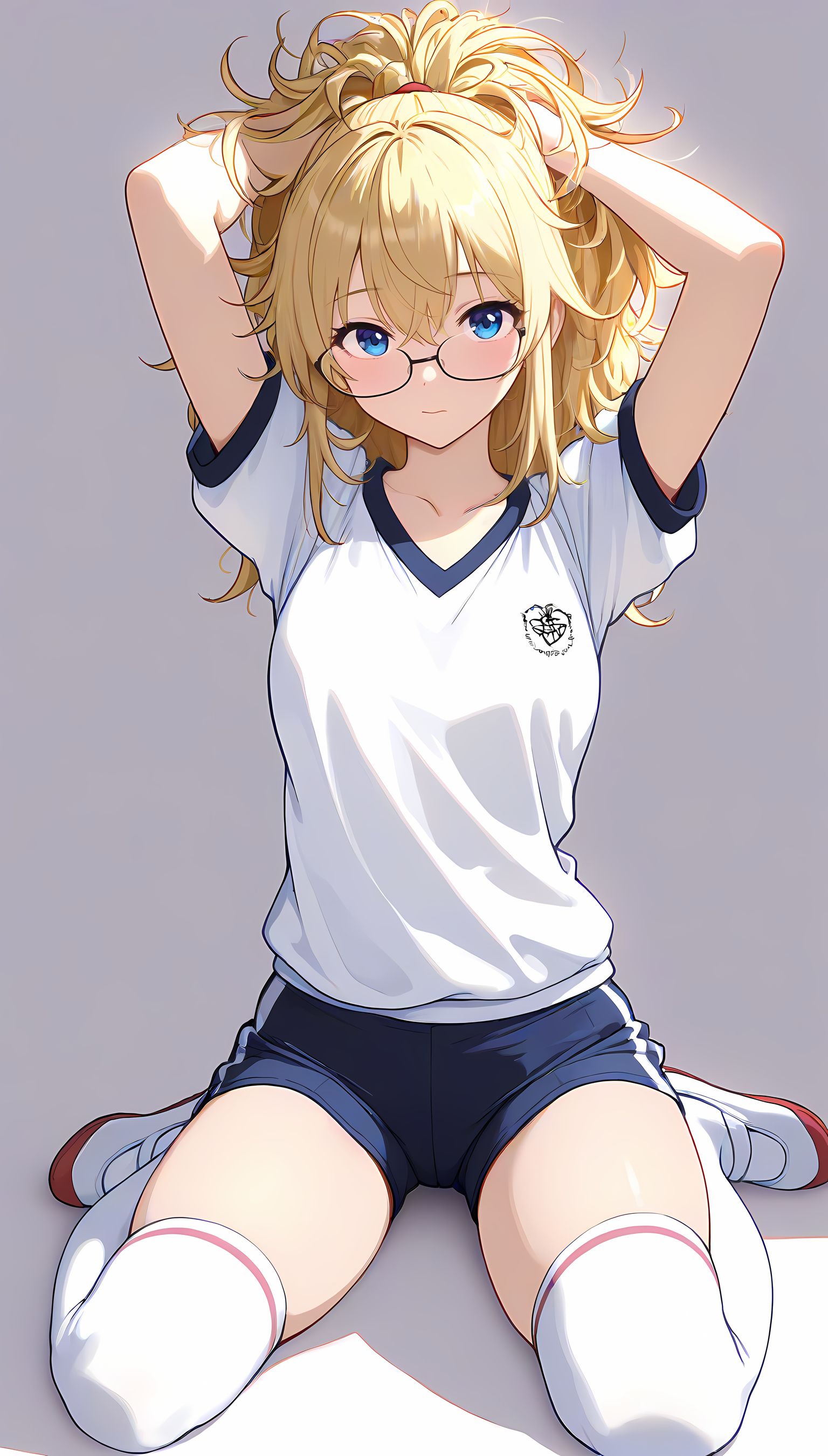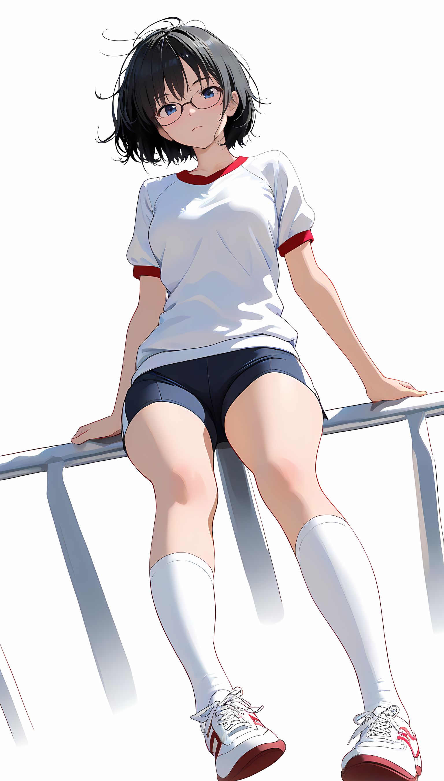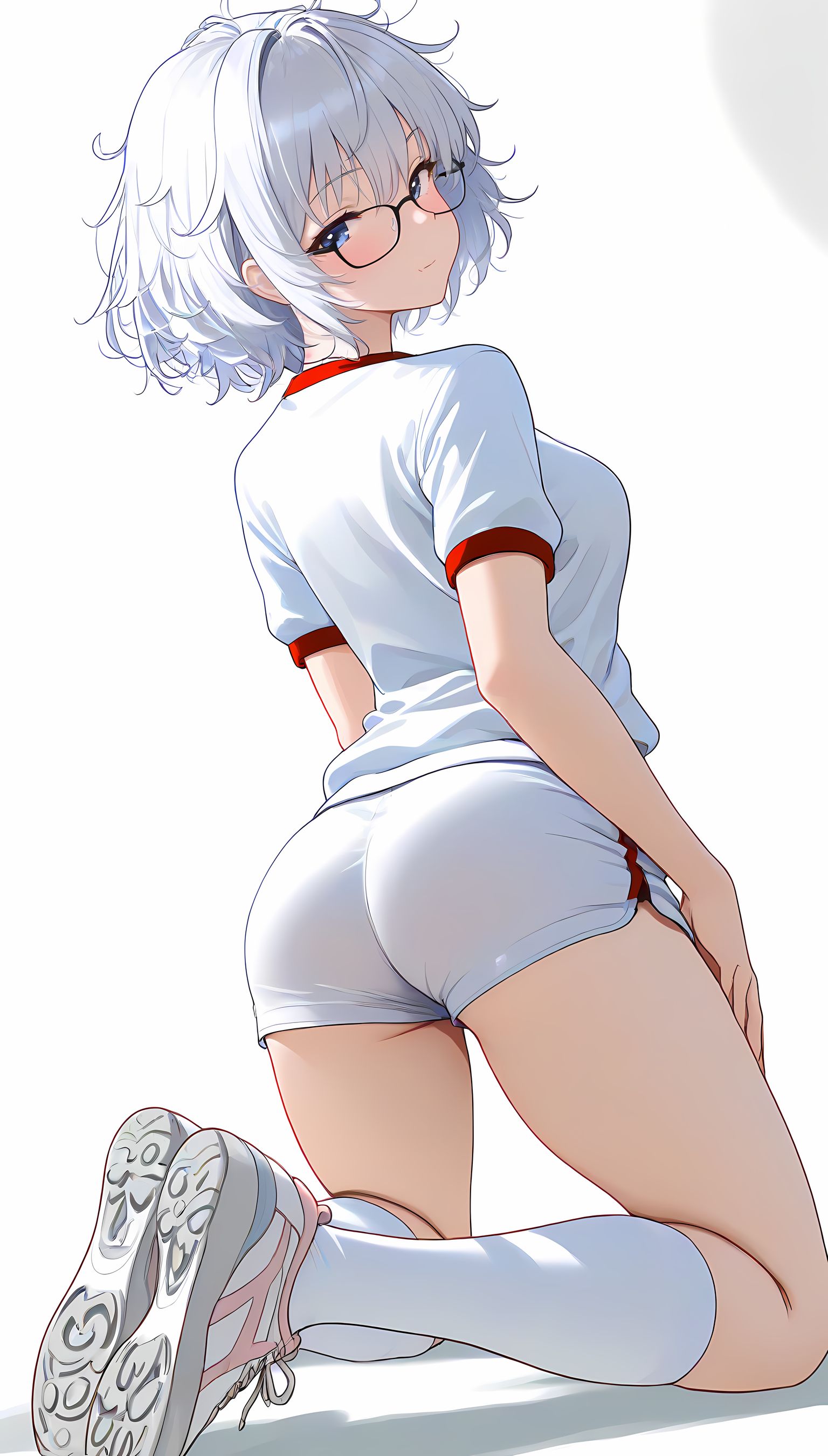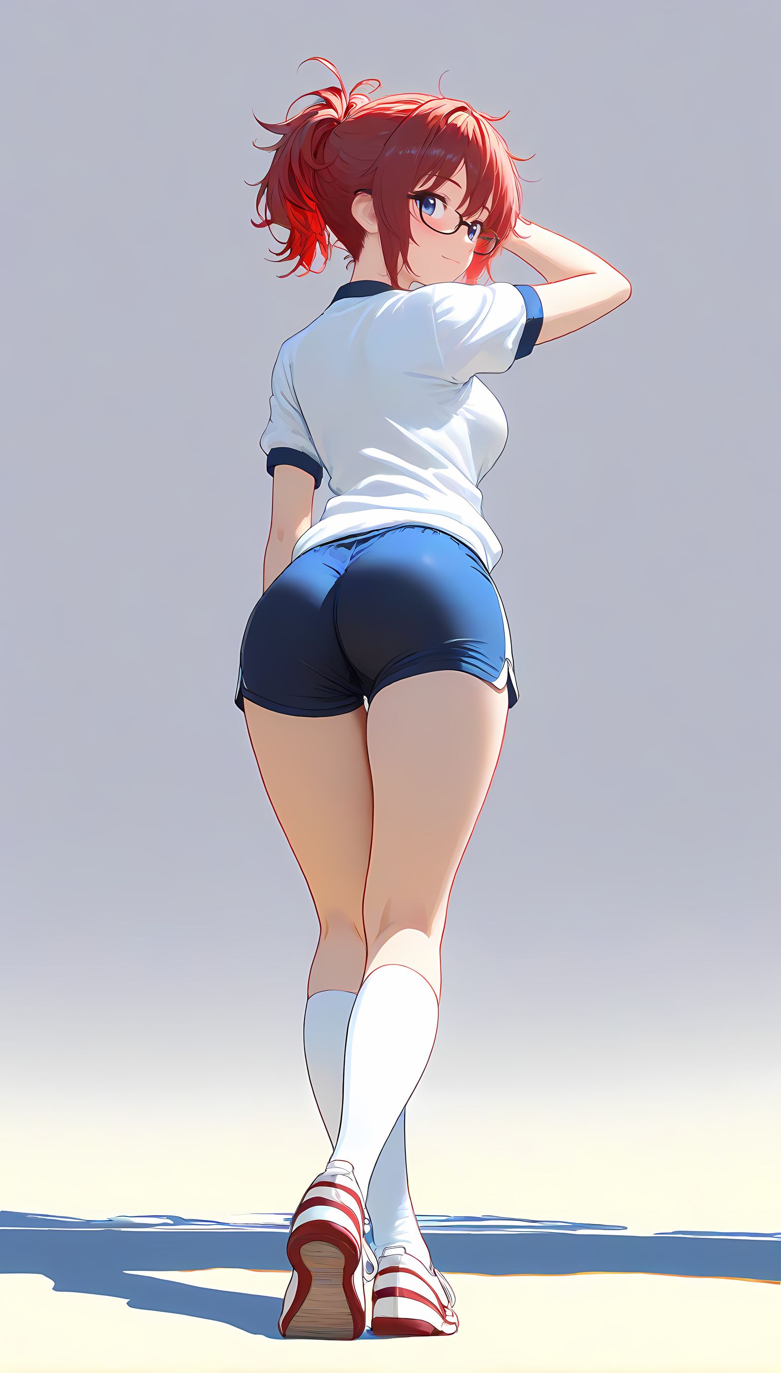 この一枚の写真は、まるでカメラマンの視点から見つめられたような、軽い艶やかさと肉感的なフィット感が特徴です。白ティシャツとブルーサイドストアンク、そして白ソックスを纏った女性の姿は、彼女の柔らかなブルマが引き立て、曲線美を際立たせています。その表情は微笑みながらも、少し挑発的な輝きが光っています。瞬間的な歪みと舒やかな微笑みが交差し、観る者の心を蠱惑的に操ります。