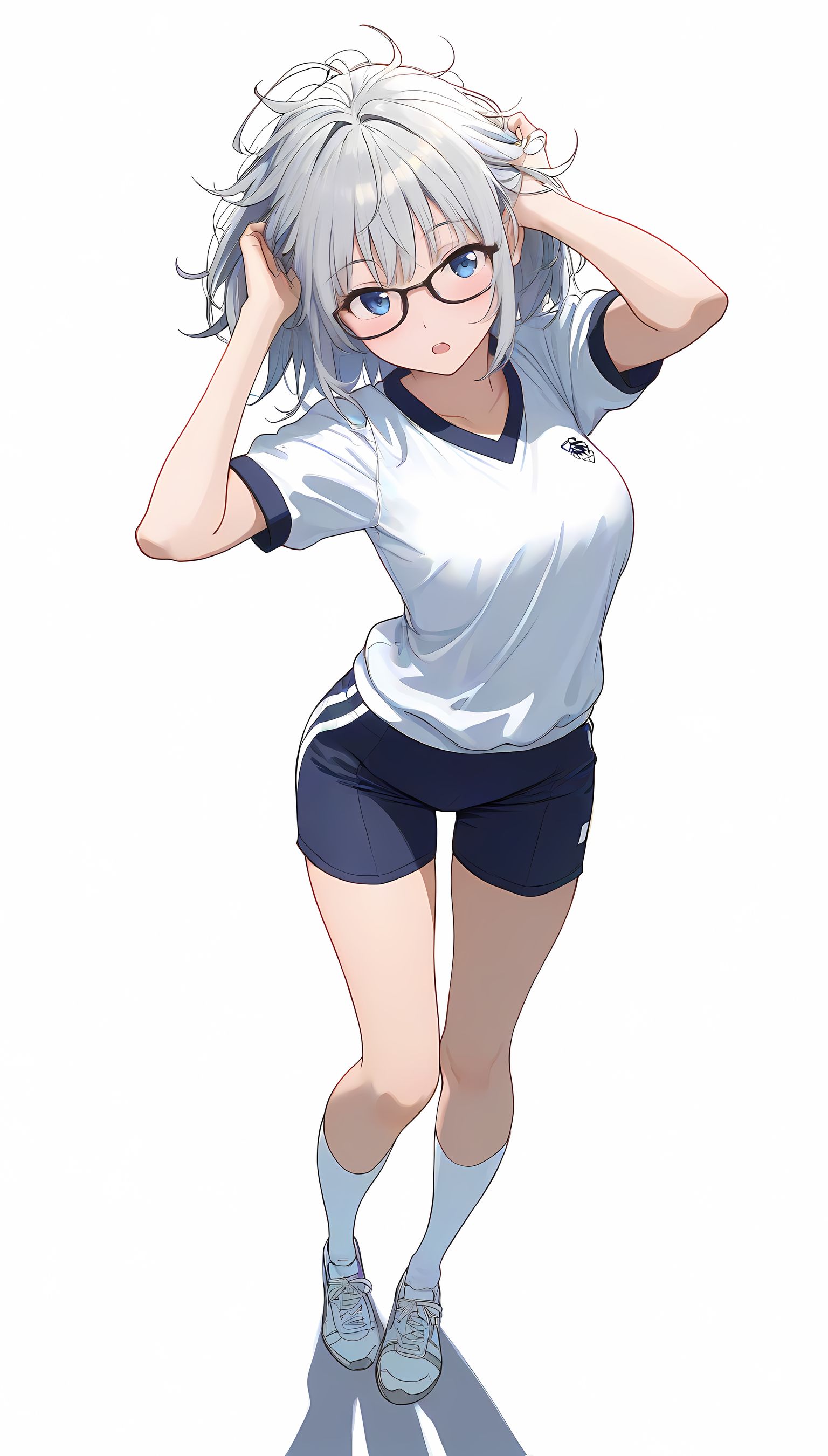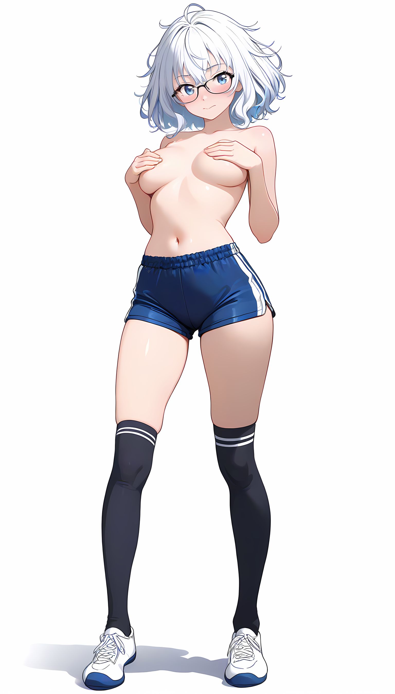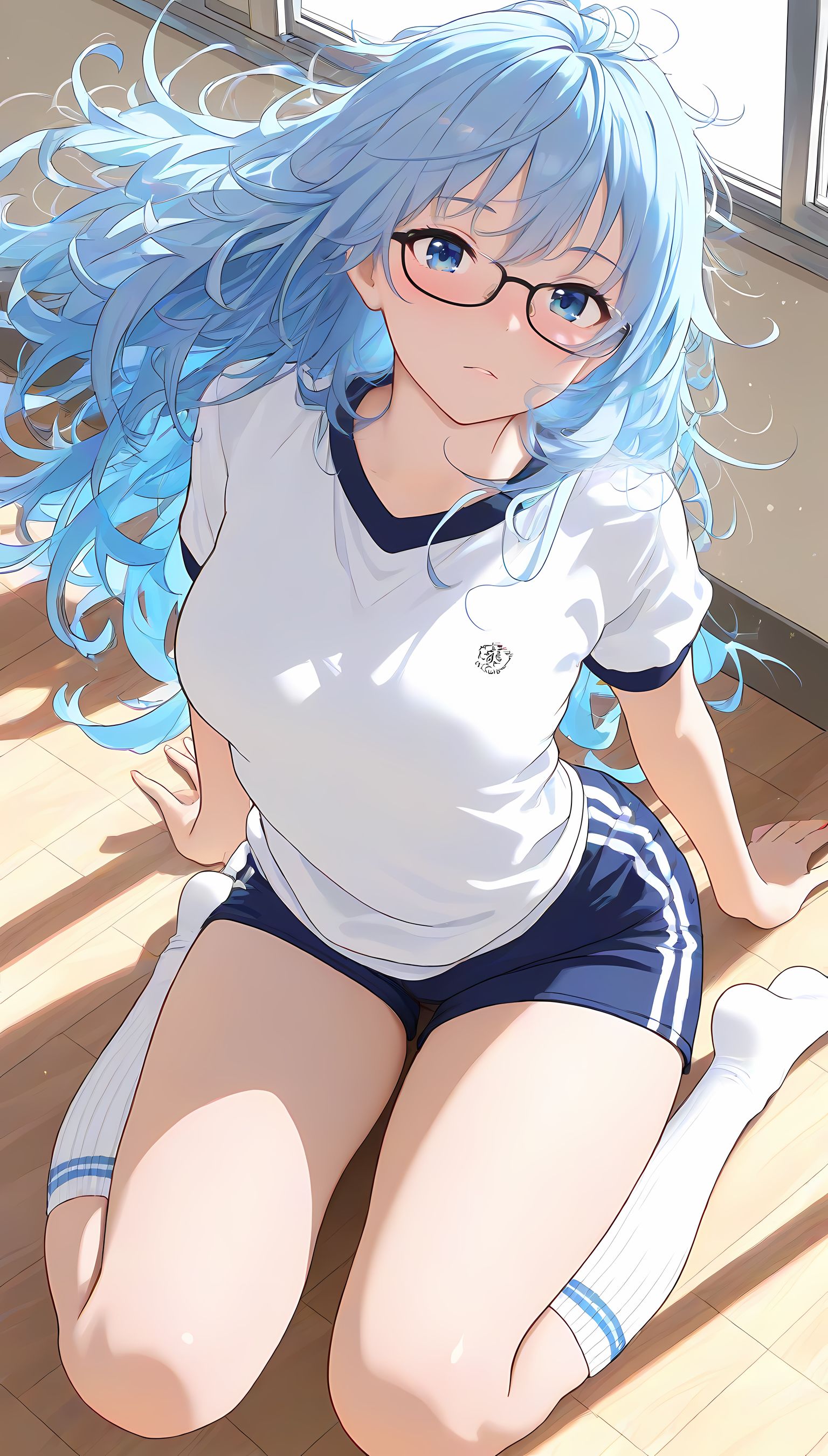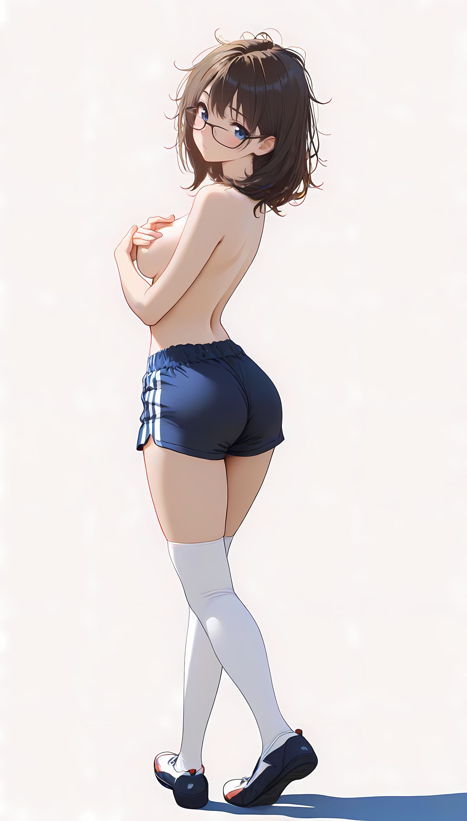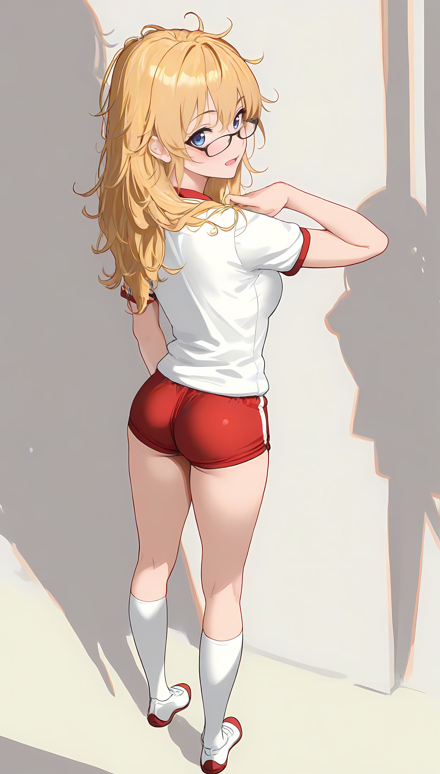 この一枚の写真は、まるでカメラマンの視点から見つめられたような、軽い艶やかさと肉感的なフィット感が特徴です。白ティシャツとブルーサイドストアンク、そして白ソックスを纏った女性の姿は、彼女の柔らかなブルマが引き立て、曲線美を際立たせています。その表情は微笑みながらも、少し挑発的な輝きが光っています。瞬間的な歪みと舒やかな微笑みが交差し、観る者の心を蠱惑的に操ります。