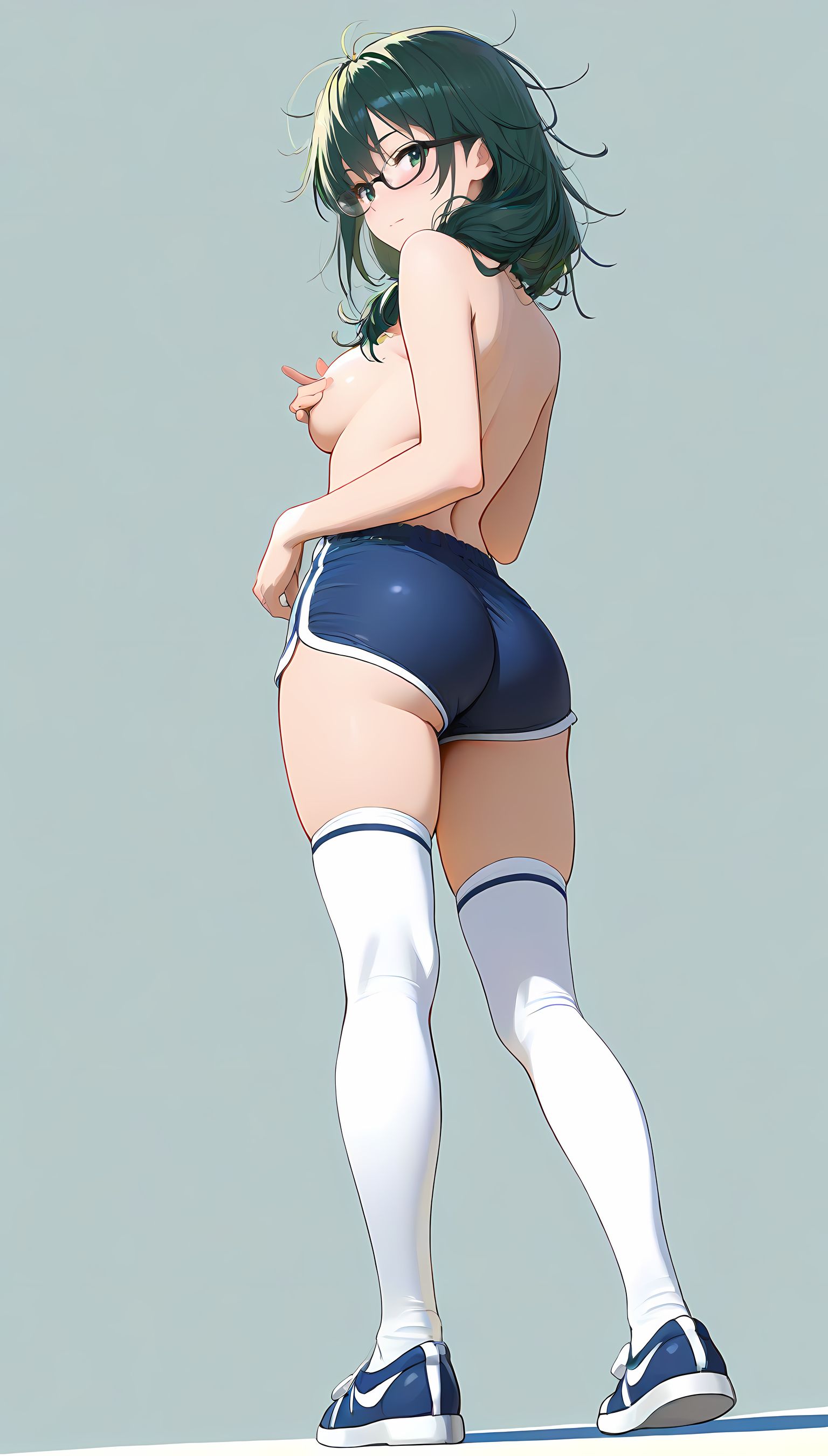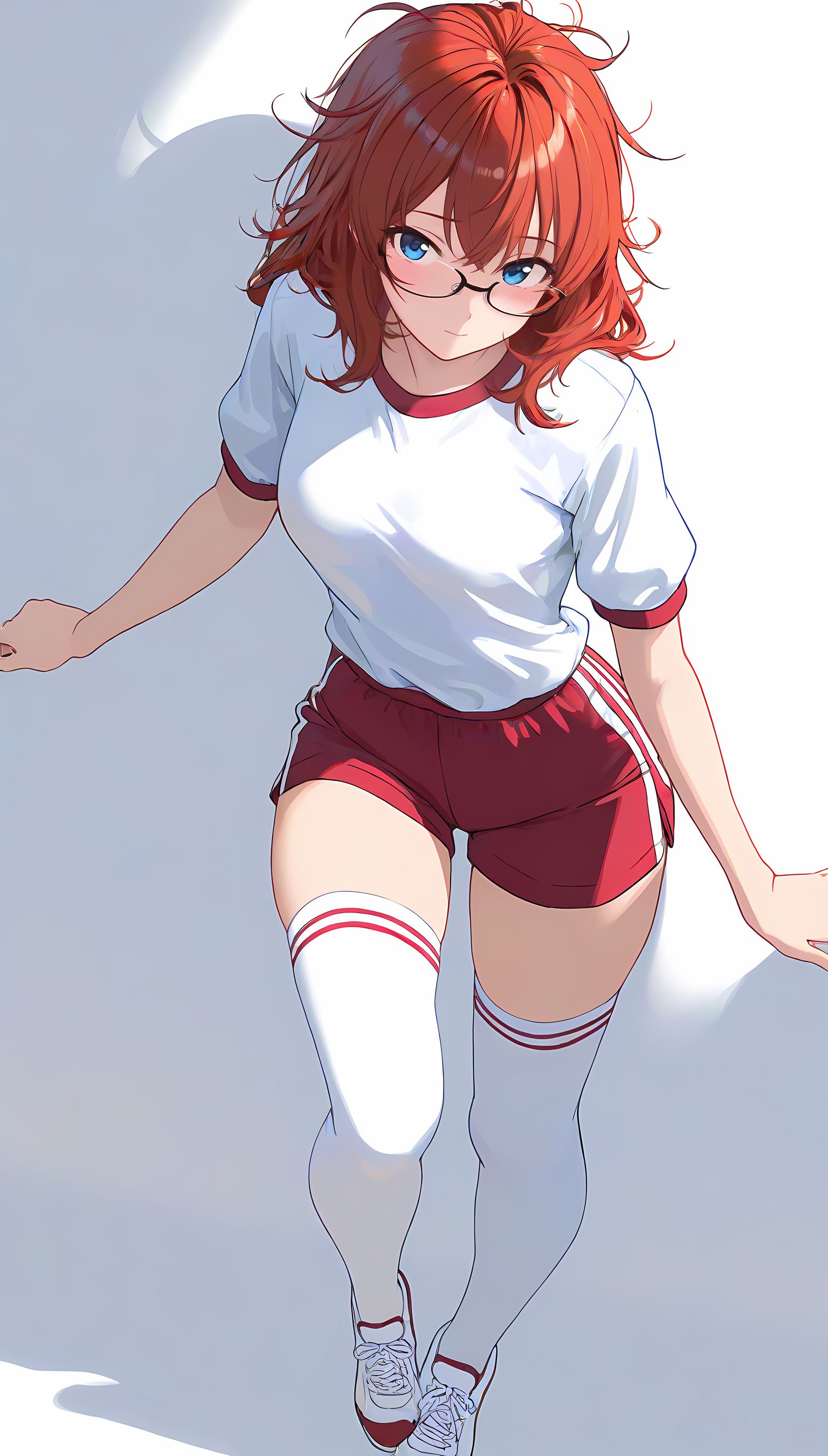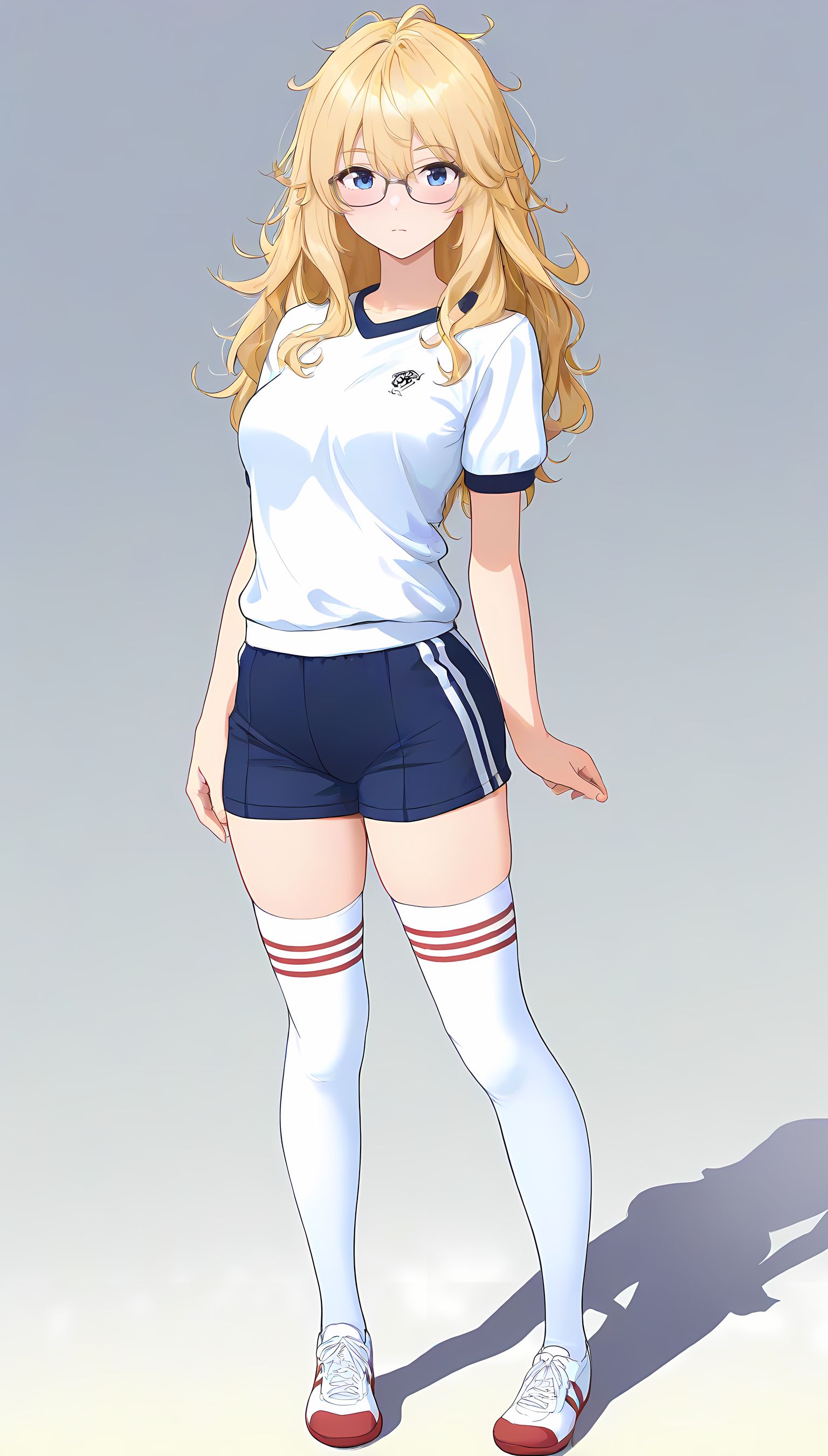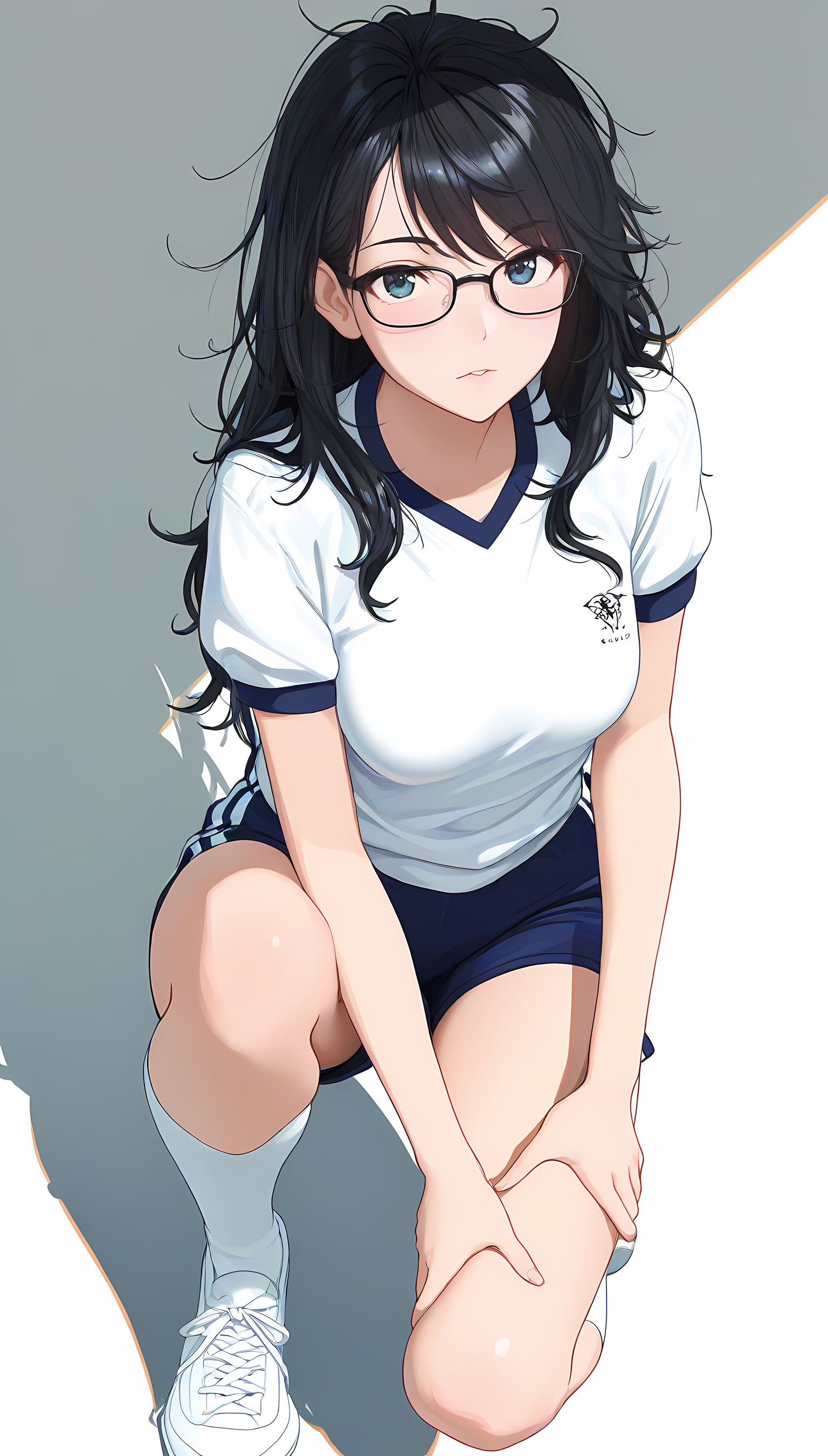 この一枚の写真は、まるでカメラマンの視点から見つめられたような、軽い艶やかさと肉感的なフィット感が特徴です。白ティシャツとブルーサイドストアンク、そして白ソックスを纏った女性の姿は、彼女の柔らかなブルマが引き立て、曲線美を際立たせています。その表情は微笑みながらも、少し挑発的な輝きが光っています。瞬間的な歪みと舒やかな微笑みが交差し、観る者の心を蠱惑的に操ります。